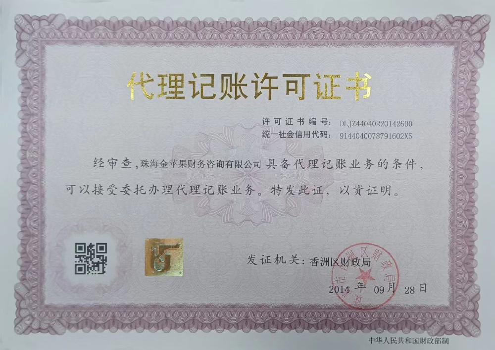 珠海金苹果财务咨询有限公司(www.zhjpg.cn),以下简称(金苹果财务),是一家经珠海工商局批准成立的财务代理服务机构,我们提供的主营业务有:企业财务代理、工商注册代理、企业审计服务等。金苹果财务成立于2006年04月,目前办公地址位于珠海市香洲人民东路143号三层东面313室。公司有多名高素质、经验丰富的工商注册咨询师、资深会计师等专业人才,同时金苹果财务与多家专业机构合作,面向广大中小企业提供营销策划、企业管理咨询、企业IPO上市咨询及代理等服务。